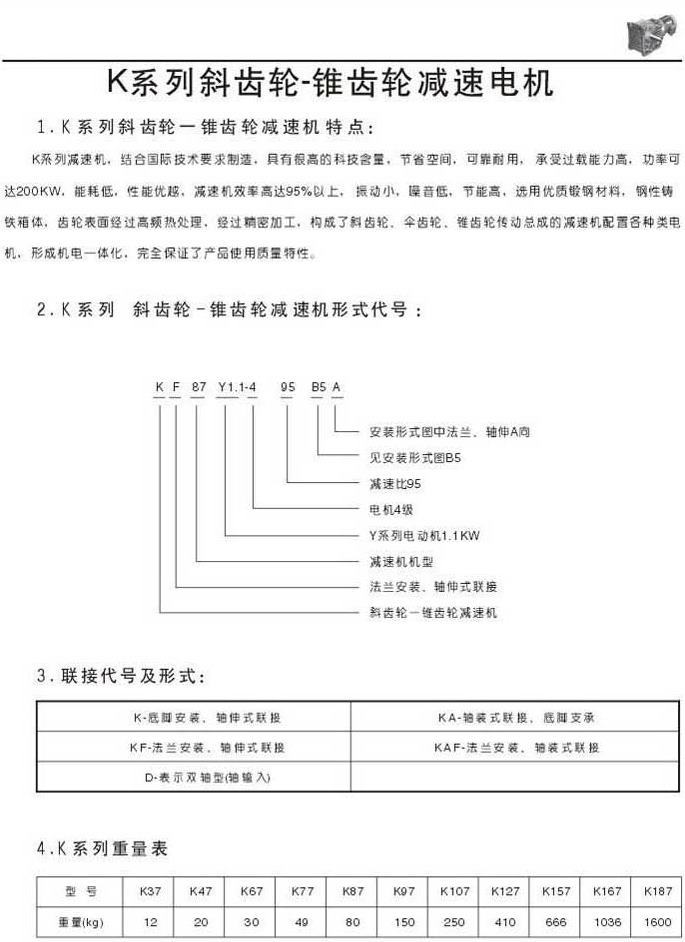 K系列斜齿轮-锥齿轮减速机特点型号表示法联结代号及形式重量表