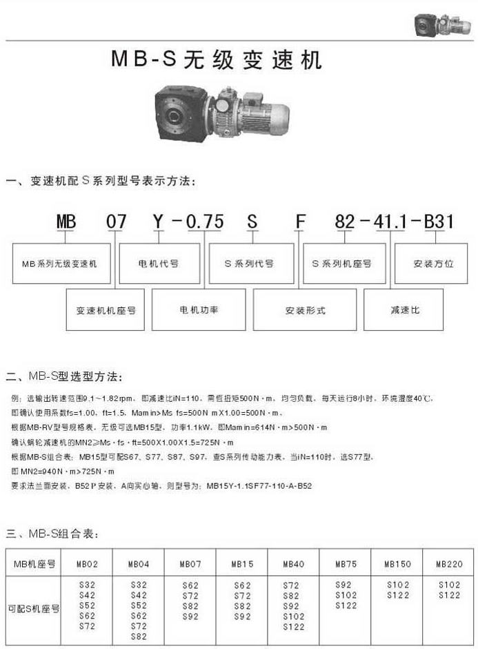 MB-S无级变速机型号表示法选型方法MB-S组合表