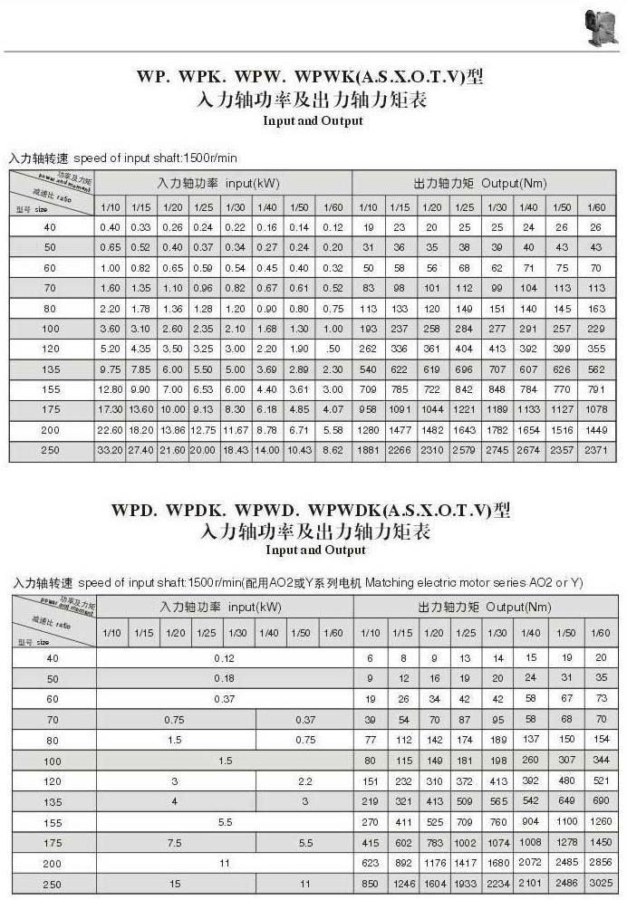 WP.WPK,WPW,WPWK(A,S,X,O,T,V)型入力轴功率及出力轴力矩表WPD.WPDK,WPDW,WPDWK(A,S,X,O,T,V)型入力轴功率及出力轴力矩表